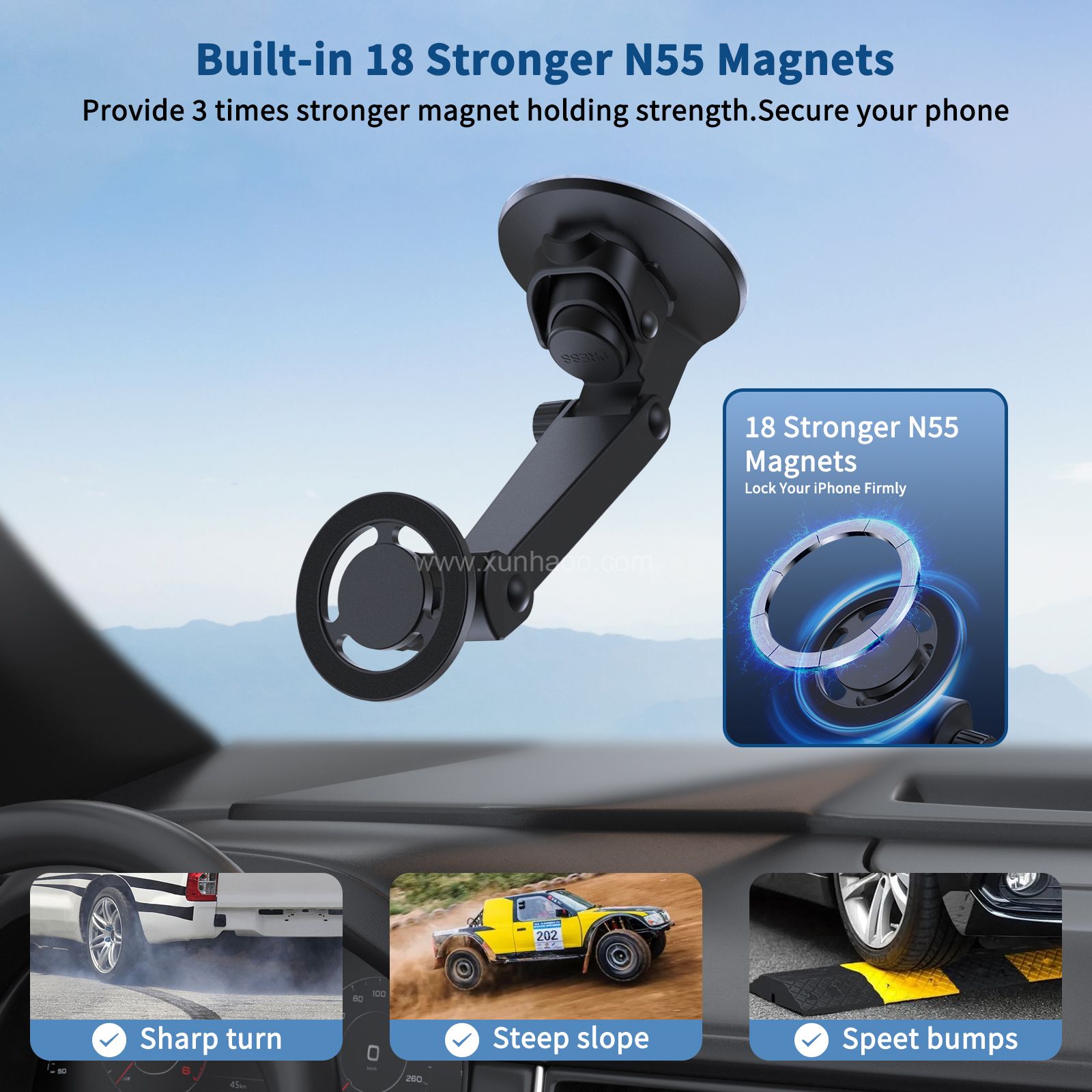 【Super Stronger Magnets】For iphone magnetic car mount constructed of a powerful suction cup base,super grip face,reinforced polycarbonate,and built-in 18 larger and stronger N55 magnets.Magnetic windshield phone mount features a PC finish for a firm grip and strong hold.Stronger magnet suction makes it can hold your phones stably.Even on bumpy roads,your phone won't fall off.Meanwhile,the closed magnetic field does not affect the phone signal.Completely free your hands and ensure safe driving.