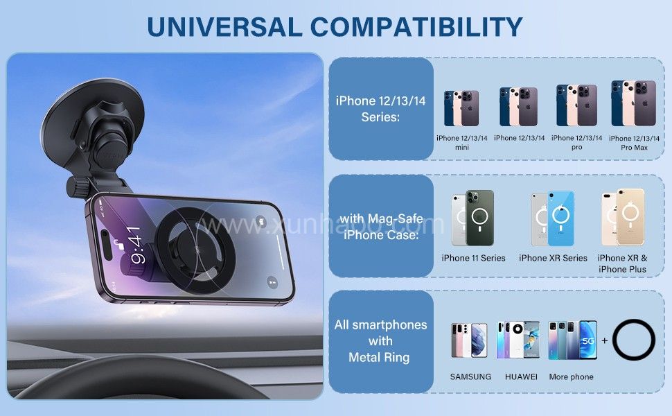 【Universal Compatibility】For mag safe car mount is designed for iPhone 14/13/12 series.Compatible with iPhone 14/14 Pro/14 pro max/14 Plus/13/13 pro/13 pro max/13 mini/12/12 pro/12 pro max/12 mini.For iPhone 14/13/12 series,move magnetic car phone holder to the back of phone or magnetic phone case.For other models phone,attach the magnet ring sticker(in the package) to the back of phone case.Then stuck the car cell phone holder on the magnet ring sticker,which is suitable for most smartphones.